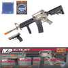 This airsoft kit gives you everything you need to go from box to shooting, including an M&P Rifle and M&P 40 Pistol. The M&P Electric Rifle features full and semi auto modes and is capable of firing BBs at 328 fps. A quad rail system permits accessory mounting. The M&P 40 Pistol is spring-operated and shoots BBs up to 325fps.  This kit features electric- and battery-powered action, a crane stock that adjusts up to 5 positions and a quad rail system with carry handle. The aluminum smooth-bore barrel utilizes the patented BAXS shooting system.. Smith & Wesson® M&P Elite Series Airsoft Rifle/Pistol Kit includes 5000 rounds of  .12g BB.