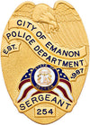 Line 1: CITY OF EMANON Line 2: POLICE DEPARTMENT Line 3: EST. Line 4: 1987 Line 5: SERGEANT Line 6: 254 Please note: Custom engraved badges take approximately 4-6 weeks for delivery. Item Features: Dimensions : 2.35'' X 3.375''