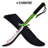Featuring an eye catching and distinctive design, the Saw Back Zombie Hunter Machete features a large fantasy inspired blade which is reminiscent of a scimitar and a long handle which allows for it to be wielded with two hands. This blade is crafted from stainless steel and features a two-toned finish, with the edge done in black and the remainder in satin. Its cutting edge is curves upward toward the tip to form a sharp point and features two spur shaped points at its bade. The spine is designed with several large saw teeth along its center and is decorated with dripping red blood. These decorations continue onto the nylon fiber handle which is green and has black nylon cord wrapped around its ends for improved grip. A black nylon sheath is included with this machete to allow for its safe storage.