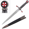 Made from steel, this decorative dagger features a double-edged blade. It has a silver-colored crossguard. The crossguard curves gently towards the blade. There are red diamonds on the ends of the arms. In the center of the guard, there is an image of the Templars seal. Then, the dagger continues with a black grip. White cord wraps around the grip in a spiral. The hilt ends with a disk-shaped pommel. It features a red cross over a white background. Finally, this dagger comes with a scabbard. The black scabbard features a silver chape and throat. The chape has the same design as the pommel. Meanwhile, the throat features an intricate shield crest design. You can add this Templar dagger to any medieval or Crusader-themed decor.