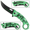 As seen on the artful graffiti-style handle, the walking dead are loose but armed with this killer karambit you will be ready for anything. The razor sharp spring assisted blade comes with an ambidextrous thumb stud to allow for swift and quick deployment. The handle offers a tactical design on aluminum framing and has a large ring hold on the pommel to help secure the knife in your hand when using. The handle is double wall reinforce and houses the liner locking mechanism to lock the blade in place. The spine offers a supporting bar with a thumb rig for extra support and the knife comes equipped with a black anodize pocket clip which is raised to allow for better ease of use.