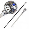 Our Crown Jewel Knob Handle Walking Cane sword has a silver finish aluminum handle with blue stone on top. The shaft is constructed of steel. Hidden inside is a 12 Inches stainless steel spear point blade for your protection. The bottom of this cane features a rubber stopper to help balance and prevent slipping.