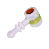 Get a taste of something new with the Slime Window Hammer Hand Pipe! Made from durable borosilicate glass, this pipe has a slightly elongated hammer style bowl head with a carb hole on the side. It's wrapped with a transparent slime green band while the rest of the body is a pearly opaque pink finish. The bowl itself is a deep amber color with a built-in slitted screen so you don't have to worry about pulling herbs through the pipe! Hand pipes are perfect for the simple everyday sesh or passing around with friends.