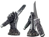 This gripping fantasy piece offers a cleverly designed knife and resin display stand. The knife offers a matching handle, sheath, and gripping hand display accented by a black with silver webbing color scheme. The sheath and display stand are further accented by black spiders. The knife measures 12" overall and features a 6 1/2" razor sharp stainless steel tanto blade. The knife is removable from the display stand for personal carrying.