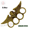Eagle/Owl Knuckles with spread wings and feathers, decorative steel Duster with an Antiqued Brass/Bronze finish. Commonly referred to as 'Brass Knuckles', these are Belt Buckles, or paperweights... designed with 'intended use' is to hold up your pants, or really windy days. From the order of the Knights Templar, the Free Masons protect their treasures from all who oppose. Forged from solid steel, and despite its novelty look - it functions like any other knuckle.