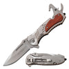 Tactical pocket knife for sale at wholesale price. The knife is 8.00 inches long overall length. Blade length is 3.25 inches long. The blade is made from 3Cr13 steel. Silver and brown tactical and rescue style handle features include can opener, cutter and pocket clip. Comes in new box.