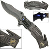 Providing 4 different useful tools, this heavy duty spring assist knife is just what you need in an emergency/survival situation. Featuring a serrated segment useful for cutting more coarse materials like rope or burlap, the 3.75 inch long clip point blade is razor sharp and up for any task- a contoured finger groove along the spine allows for the application of more force for that extra bit of cutting power. The 4.75" handle is well designed and carries three separate tools with a very bright LED flashlight joining the more familiar glass breaker and belt cutter. The LED is activated by a quick twist of the cap and shut off in the same manner. A raised pocket clip on one side of the handle makes it easier to slip on or off when needed while the reverse features the words "Military & Police" with an accompanying emblem imprint.