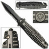 Equipped with useful tools to get you out of whatever predicament you might find yourself in, the razor sharp blade on this pocket knife makes it one of the very best knives you can carry. With a powder coated black finish and piercing dagger point tip, the serrated blade is ready for action. Textured to provide a solid grip in hand, the industrial black aluminum handle features grey accents and striping with steel bolsters and bolster lining providing strength and support for rugged everyday use.