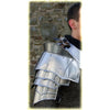 Crafted with 16 gauge thick steel, this Steel Warrior Pauldron is sectioned into 6 parts. Each section is riveted to the next and has soft leather. The sections flex smoothly and naturally to allow full range of motion. Each section overlaps the last so the entire armor pauldron protects 100% coverage. A special guard is featured at the top to protect the neck and head from the sides. Thick leather straps allow secure fitment.