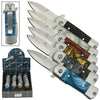Collected within a handy counter top box, this 24 piece set features 6 assorted handle styles and colors with 4 knives per style, making for an ideal pocket knife collectors set. The lightweight and compact mini Stiletto-style knives are 4.25 inches long overall with 1.75 inch stainless steel blades and each has a super strong pocket clip.