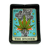 De-mystify your setup organization with the Stoner Tarot Card Ashtray! Made from glazed ceramic material, this durable accessory is heat-resistant and built for durability. The basin is decorated with tarot card filled with plumes of smoke and a 7-pointed green leaf. Each side of the ashtray has built-in cigarette rests for convenience.