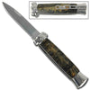 Always ready to make a sudden impact, a simple 45 degree assist of the solid steel flipper pops open the 1045 surgical stainless steel blade of this premium Striker Spring Assisted Knife. Razor sharp with a silver finish and piercing drop point tip, the thumb notched blade makes this durable folder even easier to open and use. Featuring a distinctive Rain Forest Amber Marble finish, the ABS handle features steel bolsters and bolster lining providing strength and support for rugged everyday use. A sturdy engineered steel pocket clip assures the knife will never be far from your side and readily available for use whenever you need it.