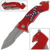 This knife offers a sleek aluminum handle with double wall reinforcement. A Confederate Flag adorns the red metallic handle. It has a beautiful finger curved on the belly of the handle which makes a better grip when using. The pommel includes an emergency glass breaker which can break any tough glass in case of an emergency. Another great emergency tool accompanying this item is the seat belt cutter which comes sharp and ready for emergency use. Use the flipper on the handle to assist this knife with a smooth opening. It comes complete with a pocket clip for easy accessibility to your knife.