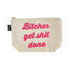 B!tch, please! Carry some sass wherever you go, with our bitch bags that were made for those who carry too much stuff! The cheeky phrase was screen-printed with eco-friendly dyes. Sometimes things get messy, so this bag is fully lined with white vinyl! Cotton Canvas with Vinyl Lining 10.5' x 7.5', with a gusseted bottom Gold Metal Zipper Design reads: Bitches Get Shit Done