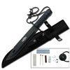Weighing in at just under a pound, this heavy duty survival knife measures 15 inches overall and features a 9.5 inch 440 stainless steel blade that is very sharp. Sporting a black anodize finish that strengthens the steel and helps to prevent rust, the drop-point style blade can be honed to an even finer edge with the included sharpening stone. A 3.25 inch serrated sawback segment on the spine of the blade can be used to cut wood and other tough materials. The handle is also made from steel with a black rubberized textured grip; a screw-off butt cap hides a compass while a survival kit (including a fishing line with hook and weight, matches to start a fire and sandpaper) is enclosed right inside the handle. The cap also includes a lanyard loop with a lanyard included. The hard black nylon sheath has a snap button closure with a pocket to hold the sharpening stone. Specifications