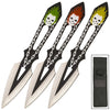Bearing a grinning demonic skull design in one of three different colors (yellow, green and red) with distinctive chain link details, these dynamic throwing knives are aerodynamically sound and almost literally tear through the air. With piercing pin point tips, each perfectly balanced knife is solidly built and is well constructed with a weight reducing arrowhead cutout in the center of the blade, a larger cutout sits farther forward on the handle. While shipping factory sharp, each of the 3 inch blades can be honed to an even finer edge and feature a satin silver finish.