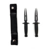 Two for the price of one! This great concealable boot knife set offers customers double the protection. Each of the two dagger style knives features a black anodize 440 stainless steel forked blade for double the protection you need in a hand to hand combat. The blade is molded onto a tough rubberized handle with excellent grip and a short guard allowing your hands not to accidentally slip on the blade, ideal for use in either a wet or dry environment. This knife comes concealable with a black horizontal durable nylon sheath with snap on securing clips. The top of the each knife boasts a lanyard hole.