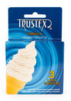 Trustex Vanilla Flavored Condoms come in a pack of 3 condoms completely safe and approved by the FDA for their strength and protection. The delicious Vanilla flavor and scented lubricant adds spice to your life. The flavored lubricant is completely sugar free.