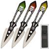 Bearing a grinning demonic skull design in one of three different colors (yellow, green and red) with distinctive chain link details and a death’s head emblem, these dynamic throwing knives are aerodynamically sound and almost literally tear through the air. With piercing pin point tips, each perfectly balanced knife is solidly built and is well constructed with weight reducing circular cutouts running down the center of the blade, a larger cutout sits farther forward on the handle. While shipping factory sharp, each of the 3 inch blades can be honed to an even finer edge and feature a satin silver finish.