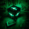 This is a wooden cube lamp with the WH4K Winged Skull Badge.