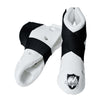 White Sparring foot / Boot made of dipped foam boot is contoured to fit and protect the foot with hook and loop closure on elastic criss cross strap for a secure fit. Designed tough for martial artists in training. Shoes Size Small.