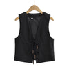 This stylish army green lace-up vest sleeveless jacket features beading and a vintage V-neck design. The waistcoat is a chic addition to any female's wardrobe. It is made of polyester and has a flattering V-neck collar.