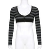 Y2K Vintage Striped Crop Top Casual Button O-neck Long Sleeves Cardigan T-shirt Retro Harajuku Grunge Super-short Smock Top Tees