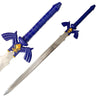 Strait from Ocarina of Time comes this Master Sword carried by Link in the Legend of Zelda video game collection. It is solid 440 stainless steel with a slightly sharp edge and mirror polished finishing. The Triforce logo is laser engraved onto both sides of the blade. High gloss blue painted guard is an exact replica from the game and followed by a handle grip wrapped in matching blue wood. Includes a wood grain wall plaque 9" x 5". Each piece is handmade and may contain slight variation.