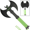 Solidly constructed from a solid slab of black anodized stainless steel for a sleek tactical look and feel, this high quality axe is perfectly balanced from top to bottom for throwing accuracy. The center of the axe features a “Zombie Killer” stamp in vivid “Zombie Killer” green. Both heads feature silver linings while the handle includes a vivid green nylon cord wrap for a solid and secure grip along with a lanyard hole at the tip. Axe comes with a FREE high quality snap fastened sheath.