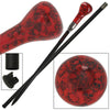 The top is constructed of acrylic with carved zombie skulls inside. The black stainless steel shaft houses a stainless steel blade to defend you in case of emergencies. Zombie Killer is screen printed on the black anodized blade.  Darkened aluminum fitting disguise the opening for the blade. At the bottom is a rubber stopper for balance and comfortable walking.