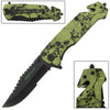 Textured to provide a solid grip in hand, the industrial green aluminum handle features an eerie shroud of skulls while steel bolsters and bolster lining provide strength and support for rugged everyday use. A sturdy engineered steel pocket clip assures the knife will never be far from your side and readily available for use whenever you need it while the rope cutter and glass breaker on the tip should prove quite useful.