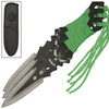 Bearing a menacing demon glare design, these dynamic throwing knives are aerodynamically sound and almost literally tear through the air. With piercing dagger point tips, each perfectly balanced knife is solidly built and is well constructed with 4 weight reducing circular cutouts running down the center of the blade. Shipping factory sharp, the 4 inch blades can be honed to even finer edge thanks to their black anodized stainless steel construction and hollow grind that also hold that edge longer. Includes a FREE 3 compartment nylon sheath.